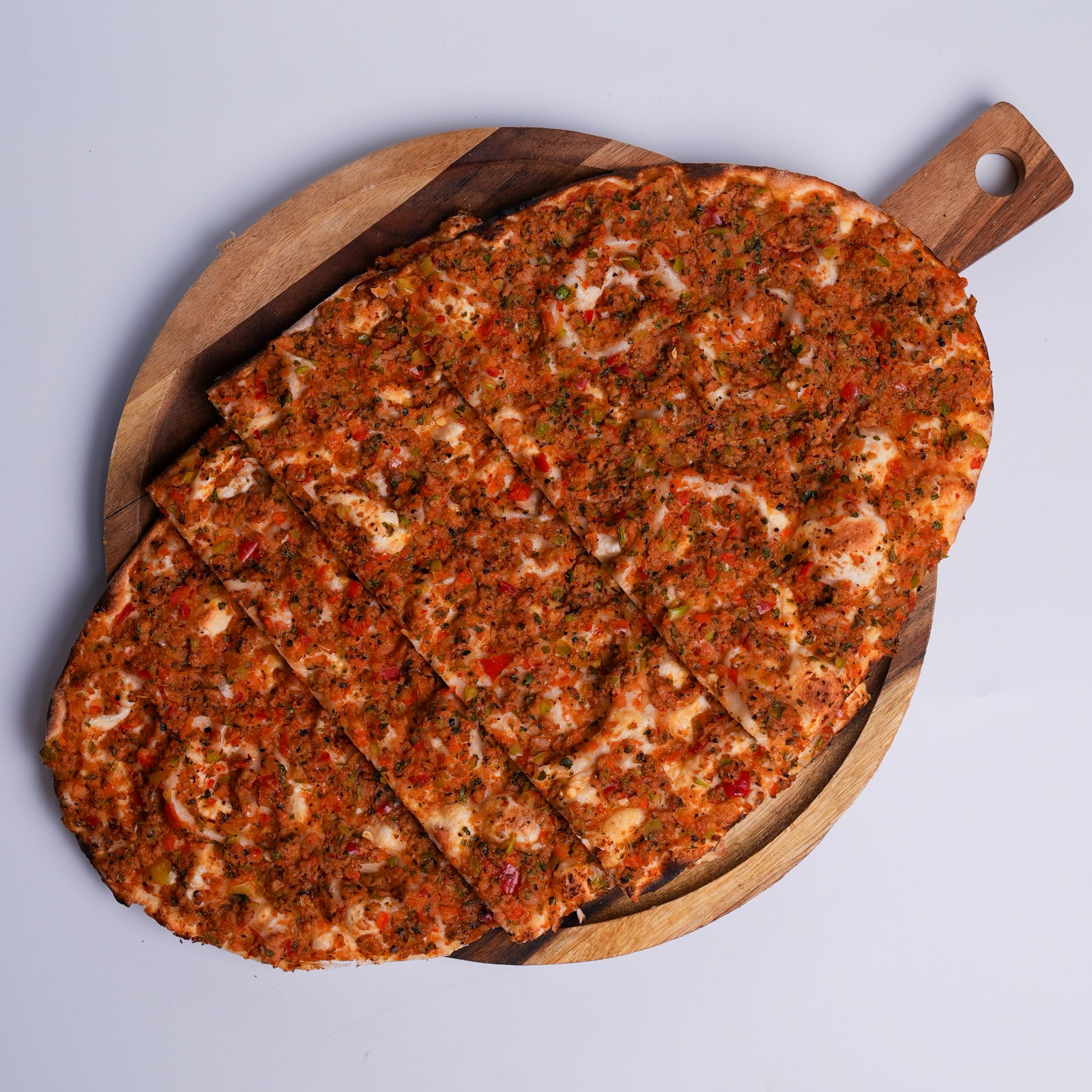 Turkish-style flatbread topped with melted cheese and spicy peperoni, baked to perfection.