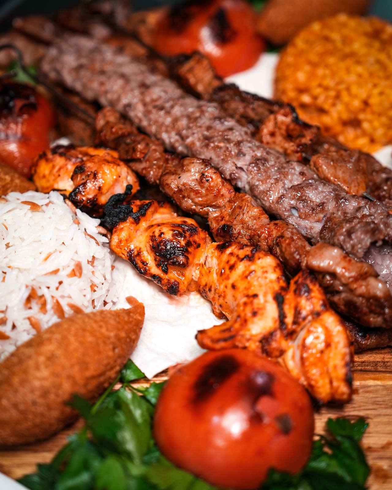 A mix of beef and chicken shawarma, adana kebab, lahmacun, chicken shish, comes with a side of rice, salad, in-house bread and traditional sauces.