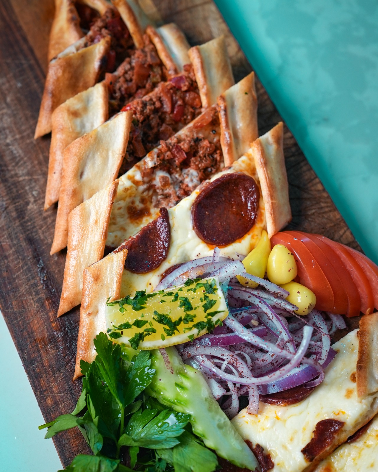 Turkish-style flatbread topped with melted cheese and spicy peperoni, baked to perfection.